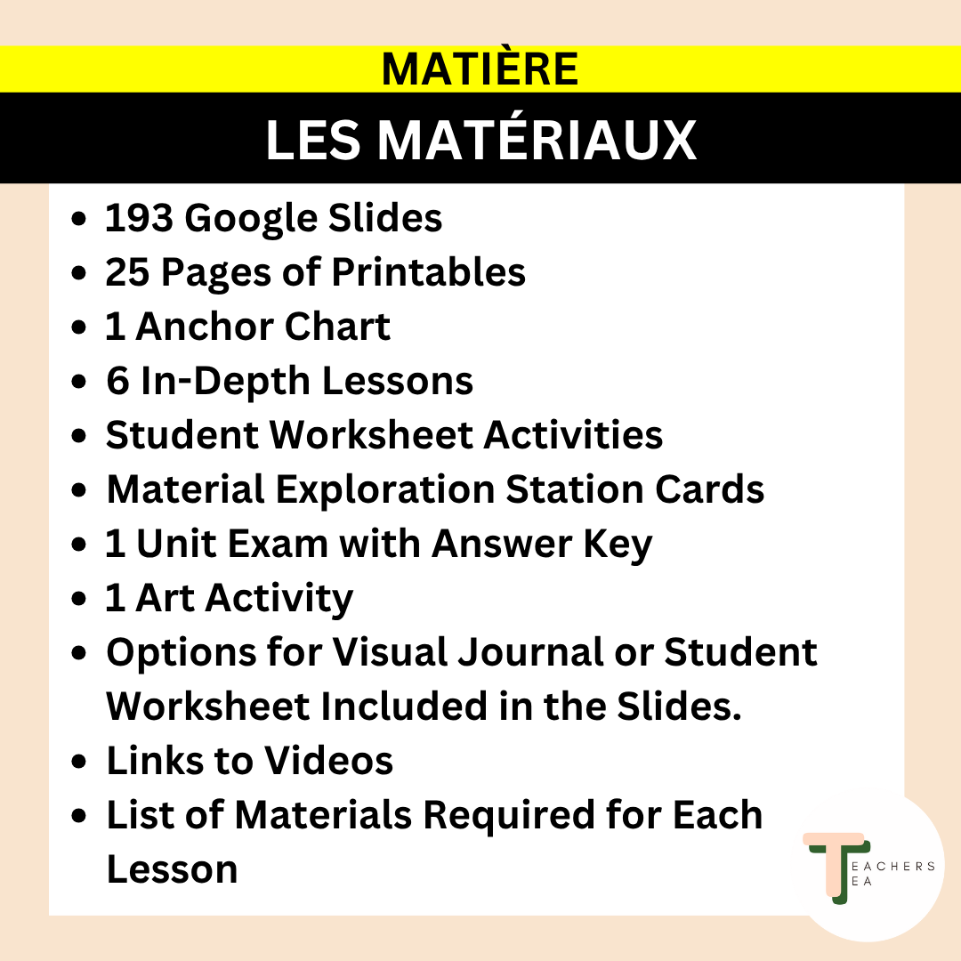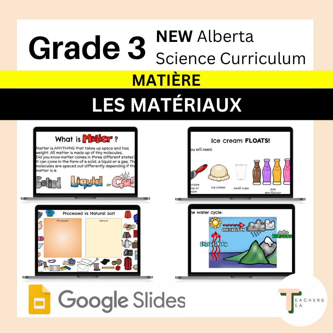 Do you need a ready to teach FRENCH resource for the NEW Alberta Science Curriculum? This is a google slides resource that covers all the Knowledge, Understanding, Skills and Procedures from the Alberta Grade 3 Science Curriculum for the Learning Outcomes for Matter.