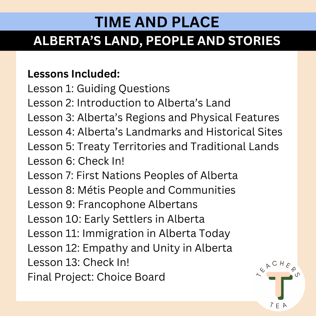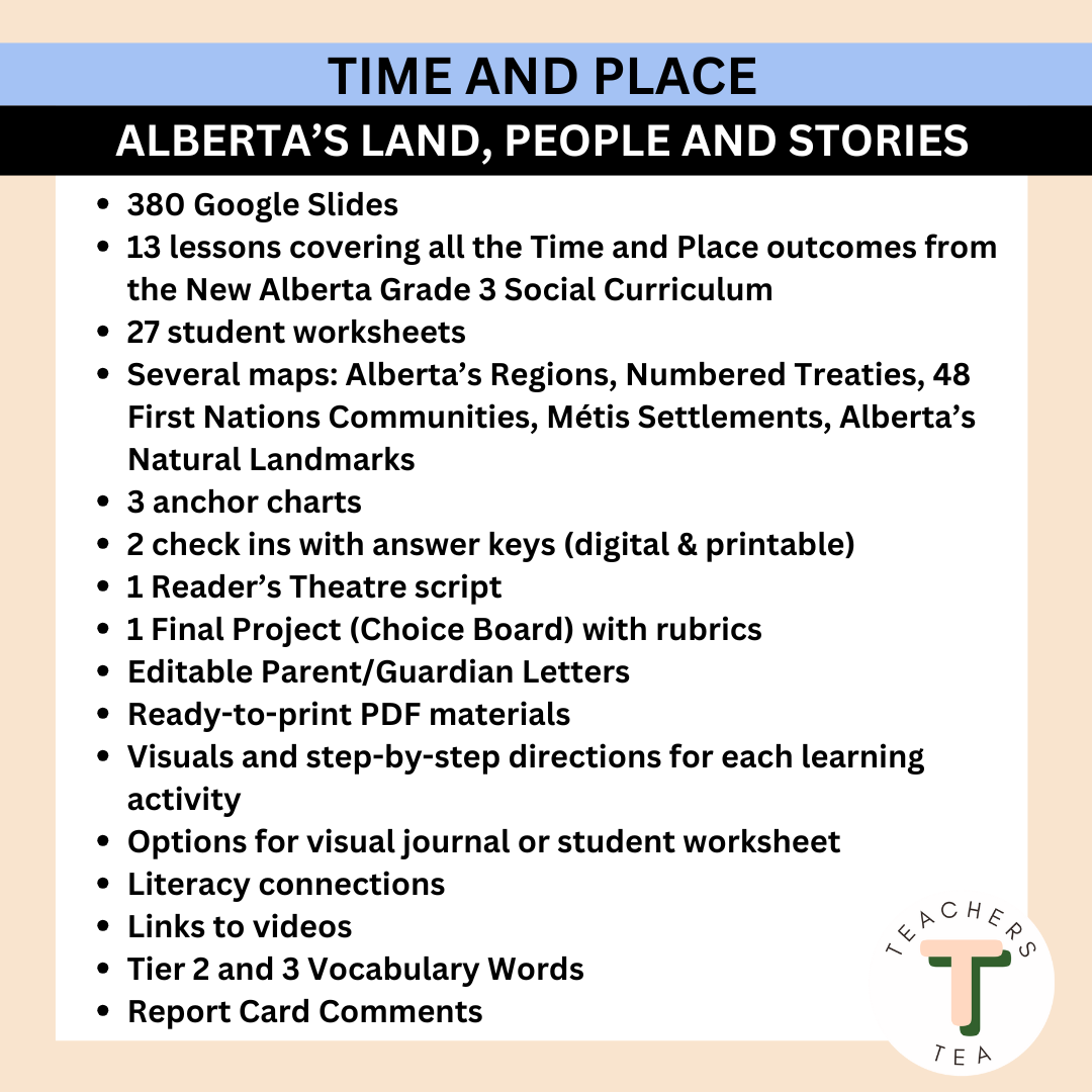 - 13 lessons covering all the Time and Place outcomes from the New Alberta Grade 3 Social Curriculum