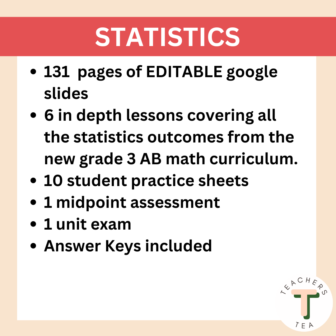 Do you need a ready to teach resource for the NEW Alberta Math Curriculum? This is a google slides resource that covers all the Knowledge, Understanding, Skills and Procedures from the Alberta grade 3 math curriculum for the Learning Outcomes for Statistics.