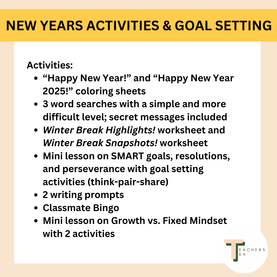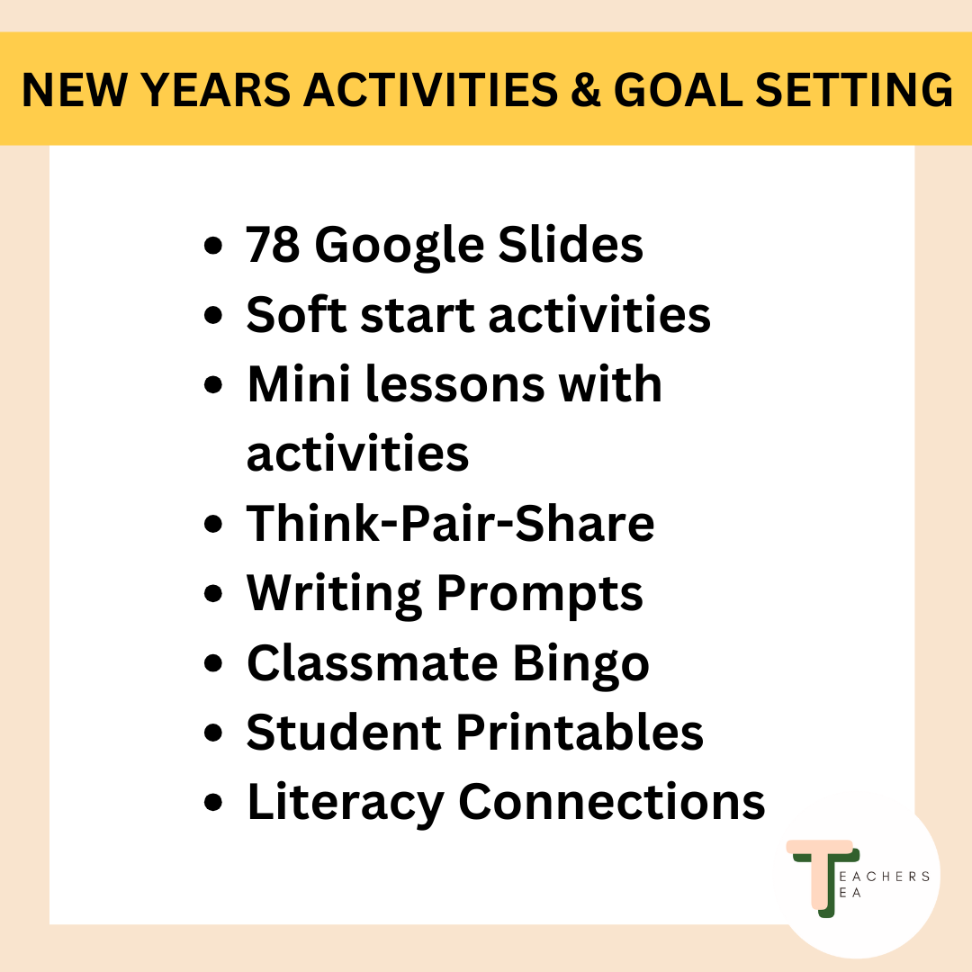 Start the new year strong with this comprehensive New Year's Goal Setting and Activities resource! With 78 engaging Google Slides, this pack has everything you need to create a fun and meaningful learning experience. Begin with soft start activities to ease back into learning, followed by mini-lessons with interactive activities and Think-Pair-Share opportunities. Spark creativity with engaging writing prompts, and build classroom community with a fun Classmate Bingo game. Dive deep into goal setting with a mini-lesson on SMART goals, resolutions, and perseverance, complete with Think-Pair-Share activities and 2 additional writing prompts. Reinforce positive mindsets with a mini-lesson and activities focused on Growth vs. Fixed Mindset. This resource is packed with engaging content to help your students set meaningful goals and start the year off right!