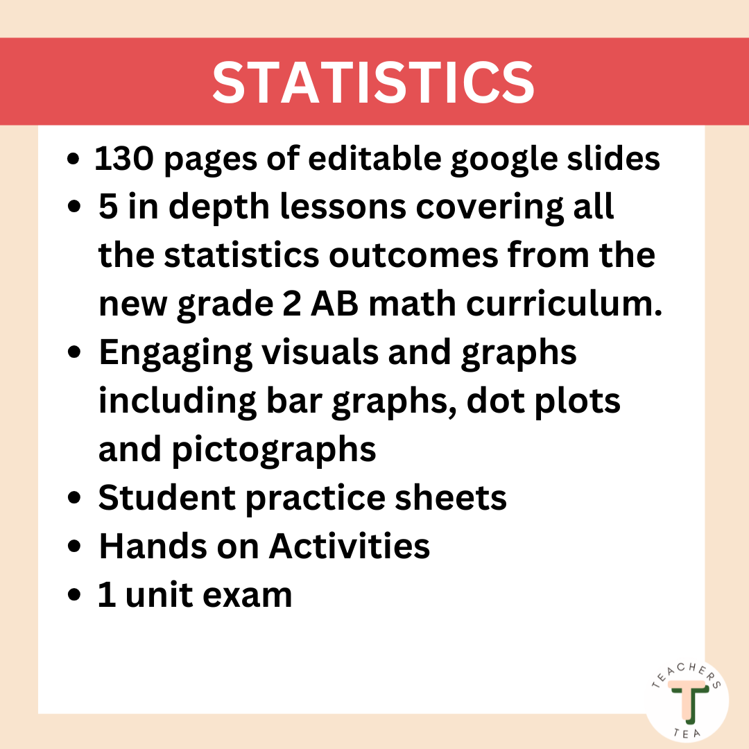 - 5 in depth lessons covering all the statistics outcomes from the new grade 2 AB math curriculum.